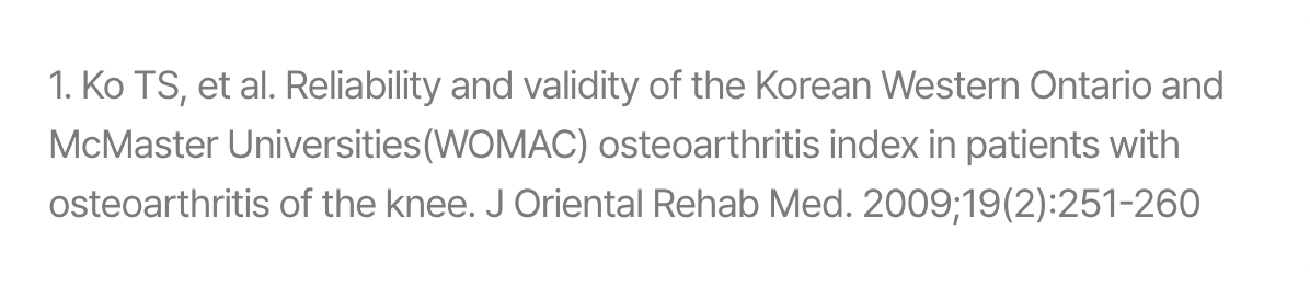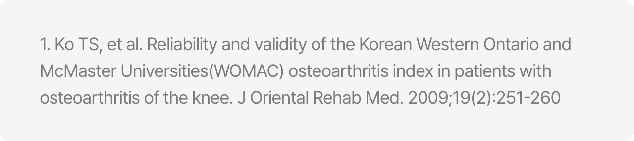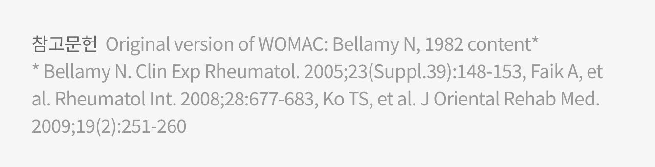 WOMAC Index는 관절염 및 관절질환에 관한 설문도구로 점수가 높을수록 증상의 악화, 활동의 제한을 나타냅니다.1